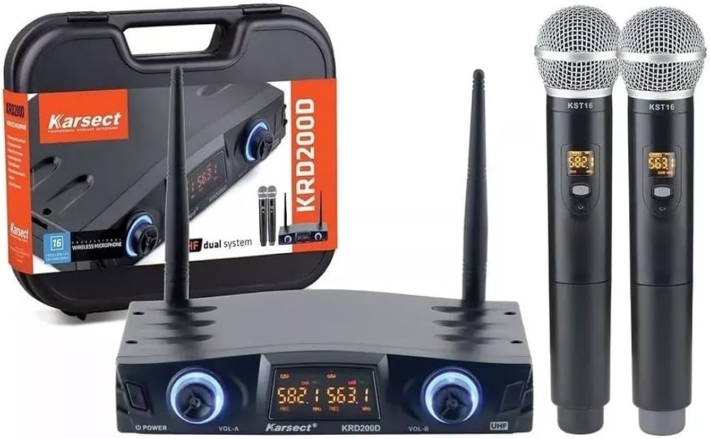 Experimente a liberdade e a qualidade do Microfone Sem Fio Karsect KRD200DM Duplo Mão. Perfeito para quem busca desempenho confiável e flexibilidade em suas apresentações.