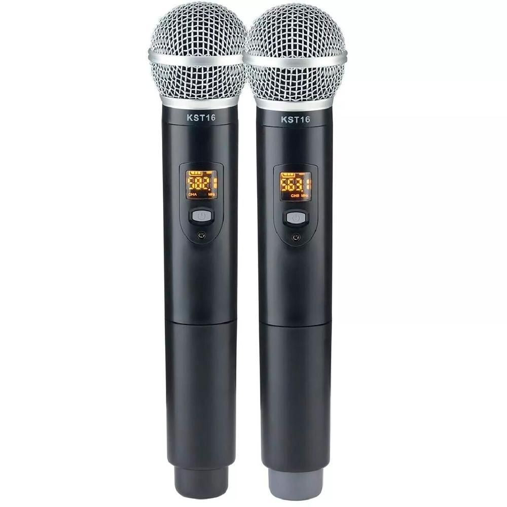 - Design Duplo Mão: Inclui dois microfones de mão, permitindo a utilização simultânea por duas pessoas, ideal para duetos, entrevistas ou apresentações em dupla.