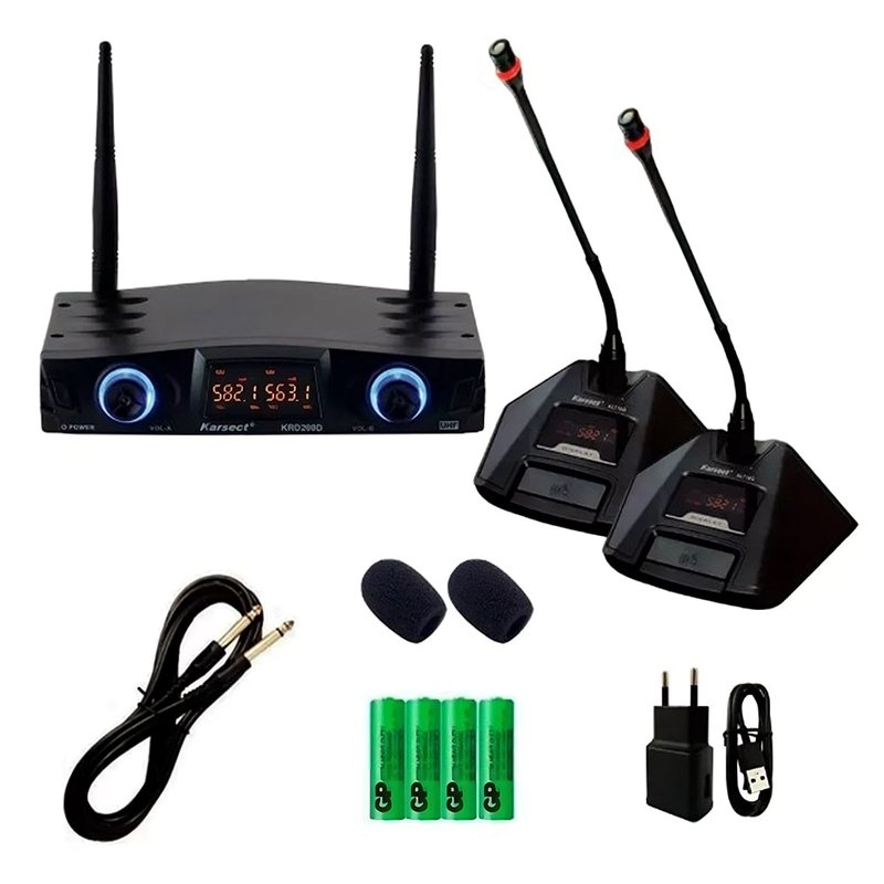 - Sistema Duplo: Inclui dois microfones independentes, ideal para conferências e apresentações em dupla.